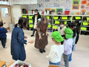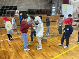 近隣の保育園やこども園から約70人の園児さんたちが小学校へ来て、1年生と一緒に「昔の遊び」を楽しみました。1年生は、生活科で学習した昔の遊びである「こま・お手玉・けん玉・あやとり・めんこ・おはじき・折り紙たこ」の遊び方を教えたり、一緒にやって見せたりして、お兄さん・お姉さんらしさを発揮していました。また、お世話になった地域の方も手伝いに来てくださり、1年生や園児さんたちに遊びのコツを教えてくださいました。